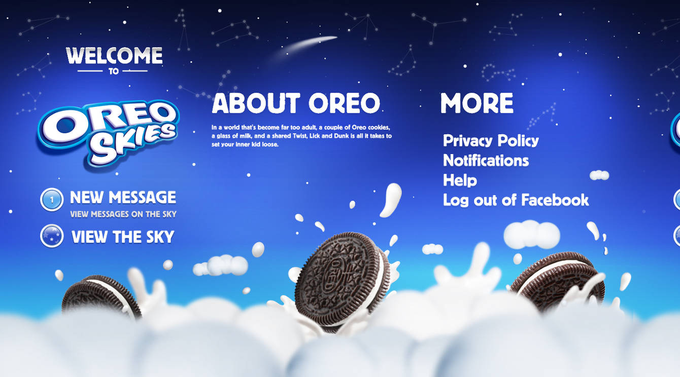 Oreo Skies, a social messaging app exclusively on the Nokia/Windows platform for Oreos. Through the connection of Facebook, gyroscope technology, AR, and constellation mapping, users were allowed to create, send, and view messages in the sky. Most active users were displayed on social media scoreboards. Winners of the scoreboard would take over the moon by posting a message for all viewers to see.